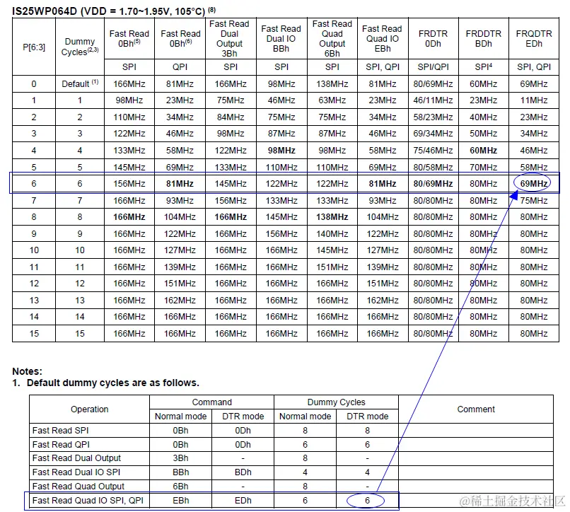IS25WP064D默认6个Dummy Cycle下对应最高DTR工作频率是69MHz,这已经达FlexSPI外设最高支持的DTR频率上限了,因此不需更改Flash里的Dummy Cycle设置了。