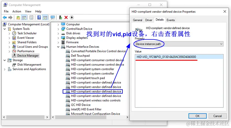 如果你觉得第二种方法还是麻烦,不想额外安装软件,得了,那就直接在Windows里查看吧。打开设备管理器,找到vid,pid是0x1fc9,0x0130(其他i.MXRT型号可能不是这个,具体查看芯片参考手册System Boot章节)的设备,右击属性里找到 Device instance path,别急,这还不是全部的USB Device Path。
