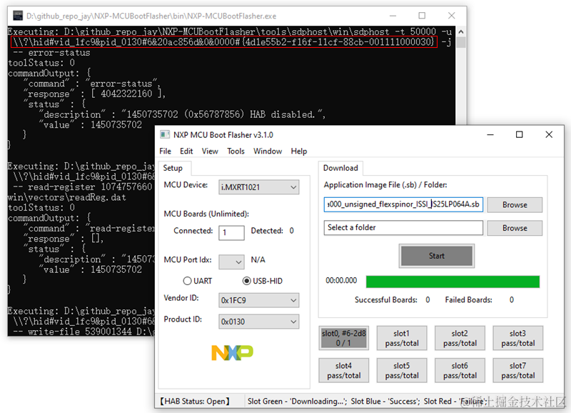 如果你不熟悉Python,觉得上一种方法麻烦,那么推荐你第二种方法,直接使用一次 MCUBootFlasher 工具,这个工具就是借助 USB Device Path 进行的多板卡量产操作。我们可以在工具GUI后面的控制台窗口里看到实际的命令序列,序列里有你想要的USB Device Path值: