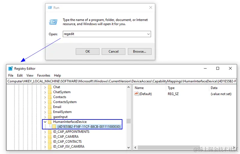 在系统命令行里输入 "regedit" 打开系统注册表,在里面搜索 "HumanInterfaceDevice",可以找到 {4d1e55b2-f16f-11cf-88cb-001111000030},这是Windows本身对HID设备的类型标识(这个其实是确定的,记住就好,不用每次都查找一次)。