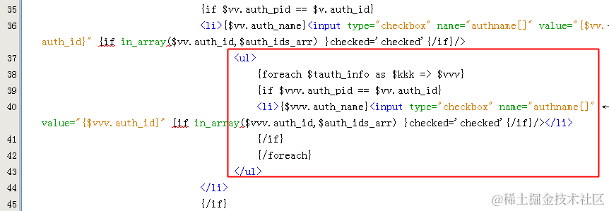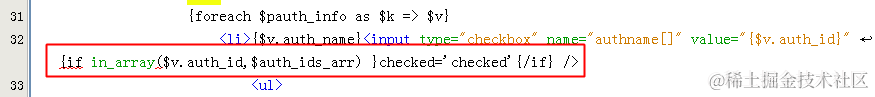 遍历权限的时候把id与ids的数组做比较,判断是否是其中的一个元素,进而设置checked属性 in_array()