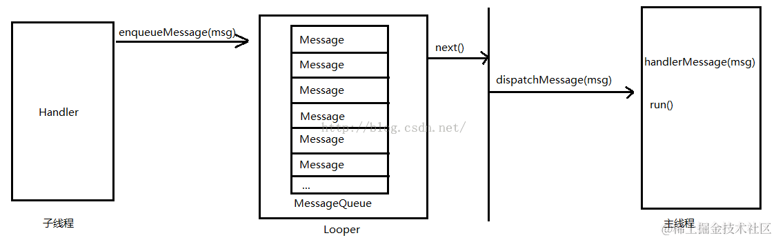 概括: 子线程获取主线程的 Looper,然后发送 Message。 Message 被压入主线程 Looper 中的 MessageQueue,Looper 从队列中取出一个消息,交给主线程中的 Handler 来处理。需注意,发消息和处理消息的 Handler 同属于某个 Handler 的实例。