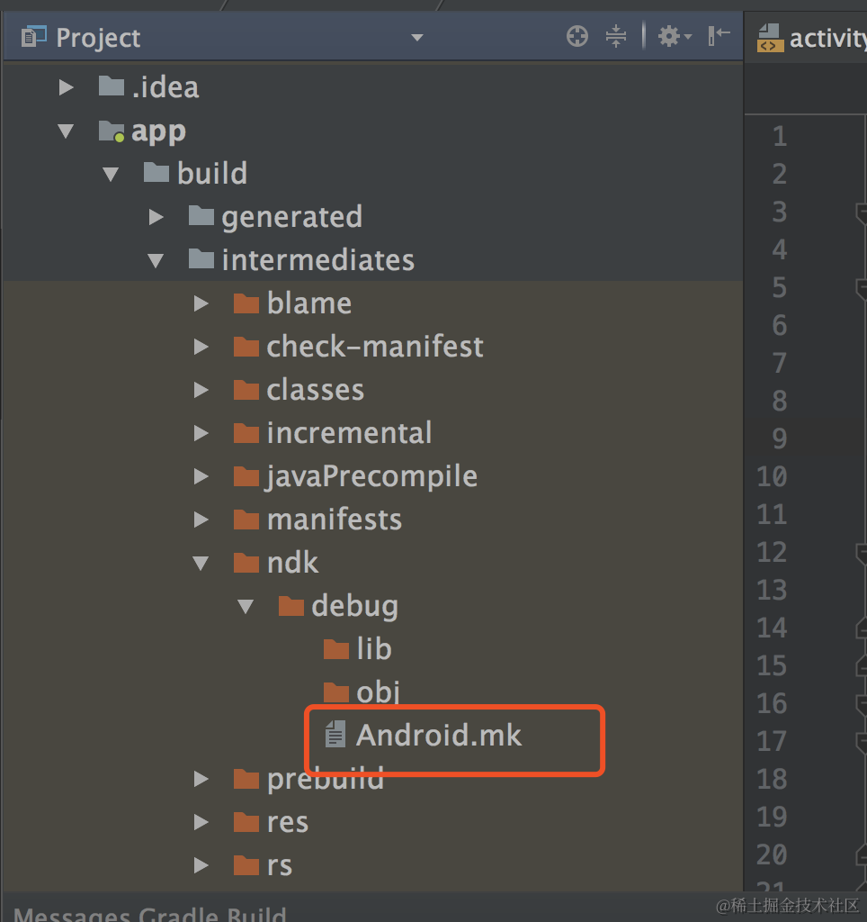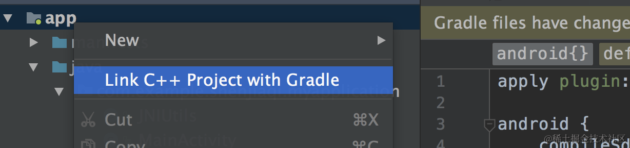 其中,有个文件叫做 Android.mk ,需要这个来为我们生成 .so 文件,操作步骤如下,先把目录切换到 Android 视角下,不然会没有 Link C++ Project with Gradle 这个选项的 :