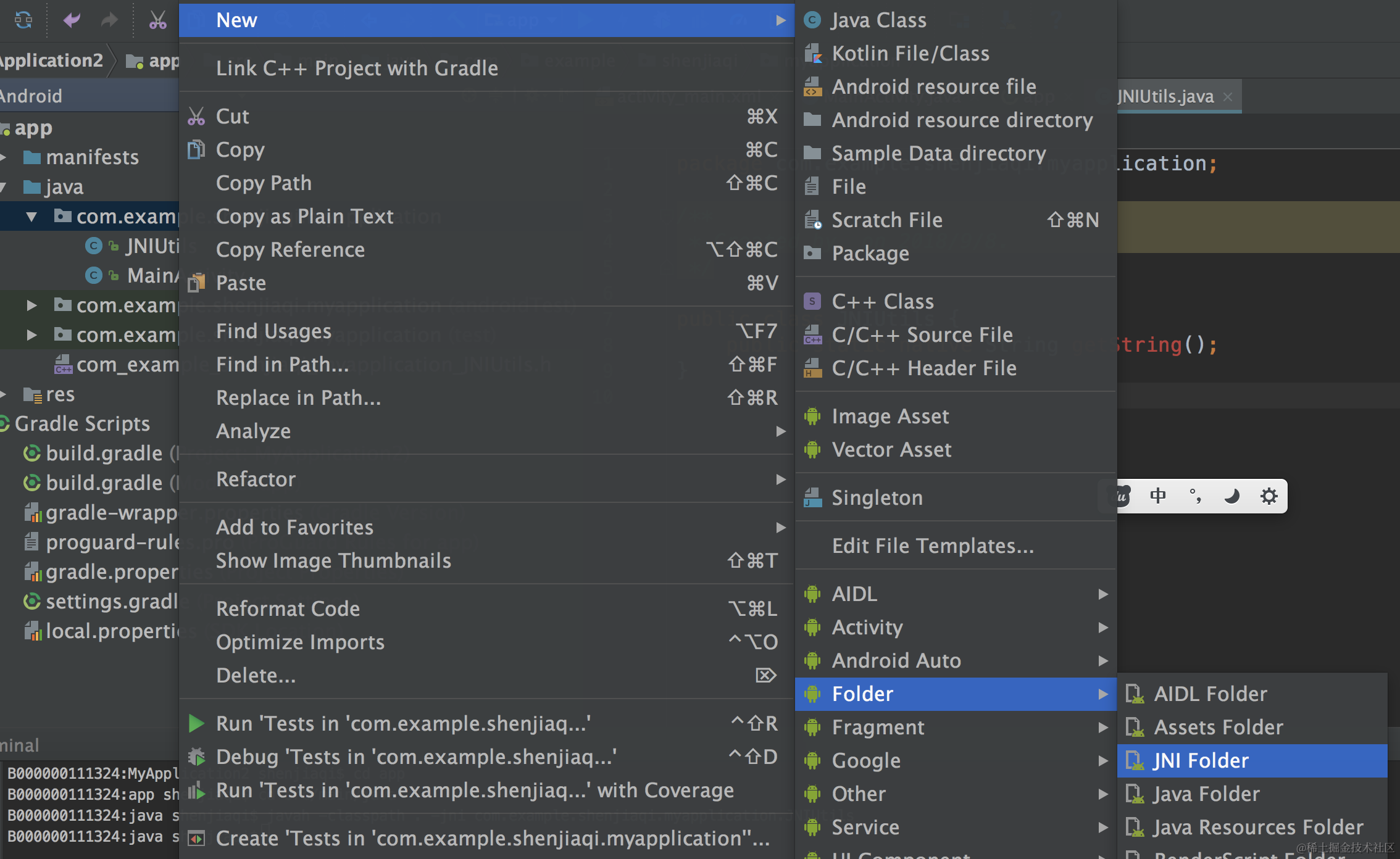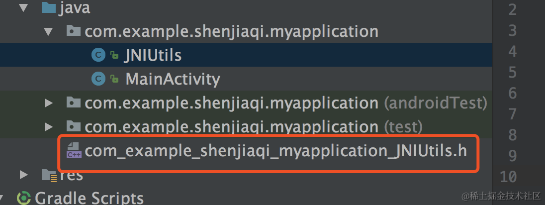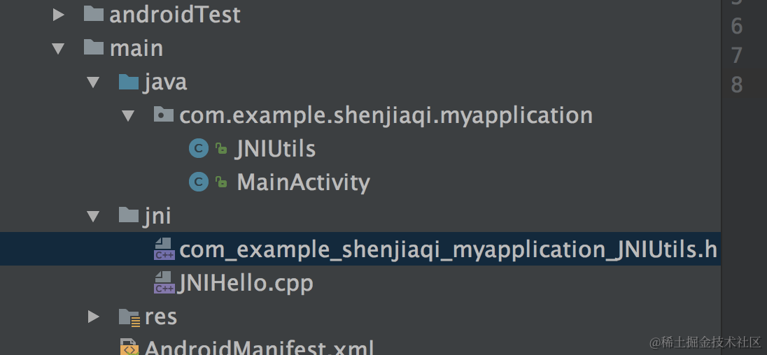 其中的 JNIUtils 下面马上就会提到。接下去,在 MainActivity 同级,新建一个类,包含一个 native 方法。