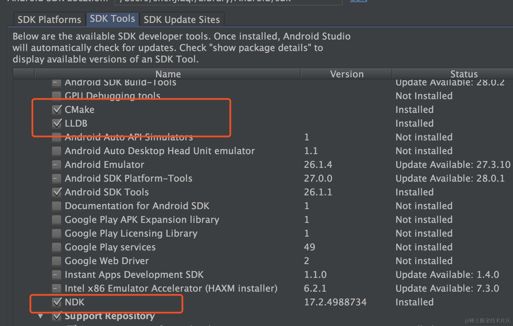首先,你需要把 NDK 相关的下载下来。如下图所示,红色框选中的都是开发中需要用到的。