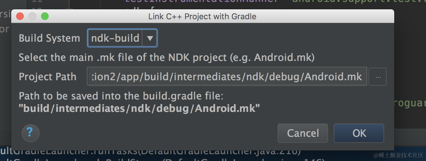在弹窗中选择 ndk-build ,找到之前说的 Android.mk 这个文件。