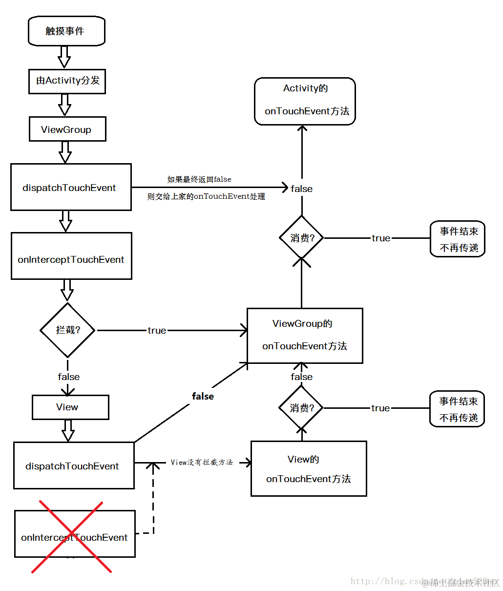 return false: 调用父 ViewGroup 或 Activity 的 onTouchEvent。 (不再往下传)。