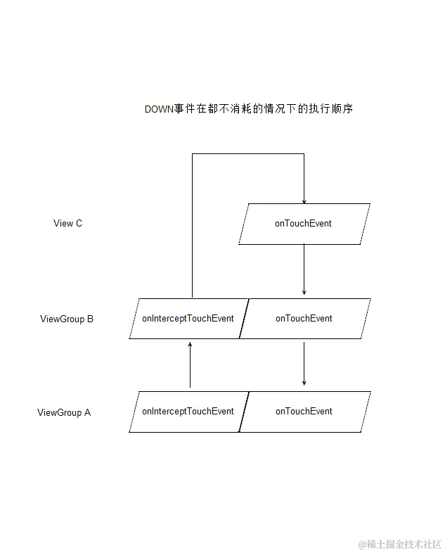 对于一个点击事件,Activity 会先收到事件的通知,接着再将其传给 DecorView(根 view),通过 DecorView 在将事件逐级进行传递。具体传递逻辑见下图: