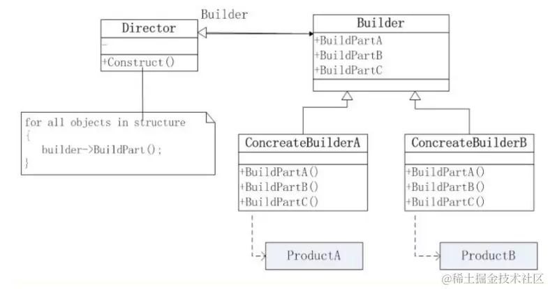 - Builder——抽象类, 规范产品的组建,一般是由子类实现具体的组件过程。
