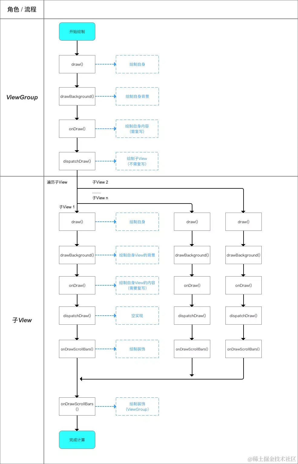 这一步也可以归纳为 ViewGroup 绘制过程,它对子 View 进行了绘制,而子 View 又会调用自身的 draw 方法来绘制自身,这样不断遍历子 View 及子 View 的不断对自身的绘制,从而使得 View 树完成绘制。