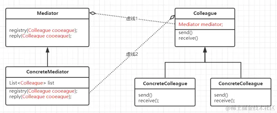 - 具体中介者(ConcreteMediator)角色:实现中介者接口,定义一个 List 来管理同事对象,协调各个同事角色之间的交互关系,因此它依赖于同事角色。
