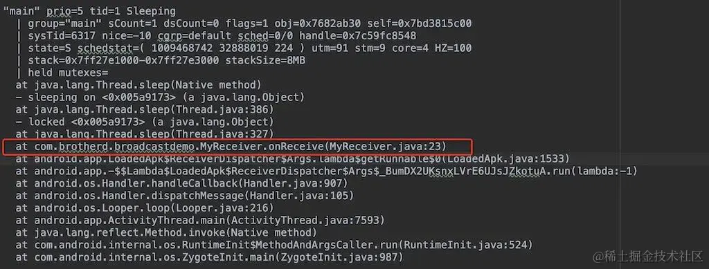 这就是造成 ANR 的根本原因。在 MyReceiver 类的 onReceive 方法中调用了 Thread 的 sleep 方法导致主线程阻塞,造成 ANR。