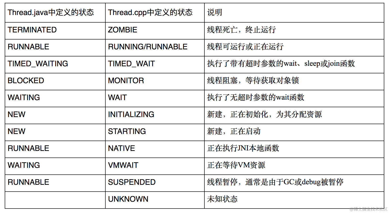 Thread.java 中的状态和 Thread.cpp 中的状态是有对应关系的。可以看到前者更加概括,也比较容易理解,面向 Java 的使用者;而后者更详细,面向虚拟机内部的环境。traces.txt 中显示的线程状态都是 Thread.cpp 中定义的。另外,所有的线程都是遵循 POSIX 标准的本地线程。
