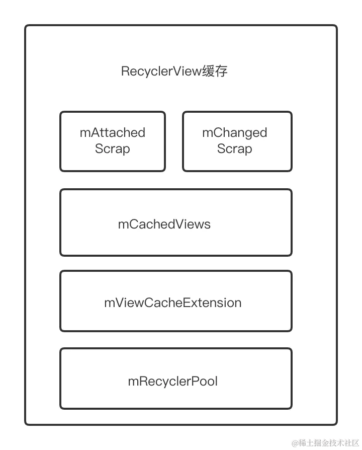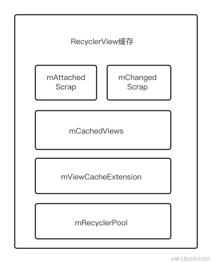 由图可知,RecyclerView 缓存是一个四级缓存的架构。当然,从 RecyclerView 的代码注释来看,官方认为只有三级缓存,即mCachedViews是一级缓存,mViewCacheExtension 是二级缓存,mRecyclerPool 是三级缓存。从开发者的角度来看,mAttachedScrap 和 mChangedScrap 对开发者是不透明的,官方并未暴露出任何可以改变他们行为的方法。
