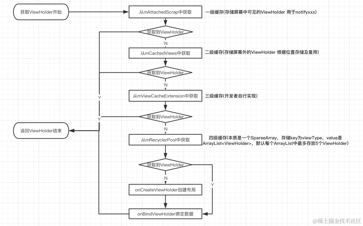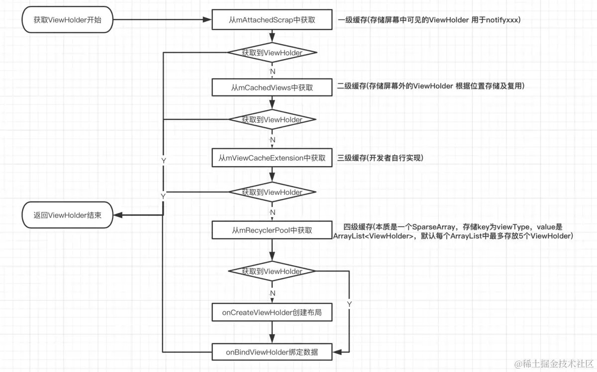 总结一下上述流程:通过 mAttachedScrap、mCachedViews 及 mViewCacheExtension 获取的 ViewHolder 不需要重新创建布局及绑定数据;通过缓存池 mRecyclerPool 获取的 ViewHolder不需要重新创建布局,但是需要重新绑定数据;如果上述缓存中都没有获取到目标 ViewHolder,那么就会回调 Adapter#onCreateViewHolder 创建布局,以及回调 Adapter#onBindViewHolder来绑定数据。