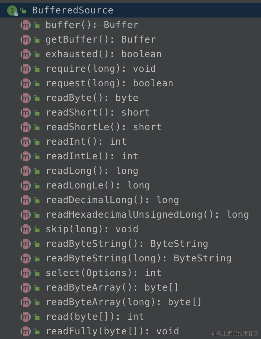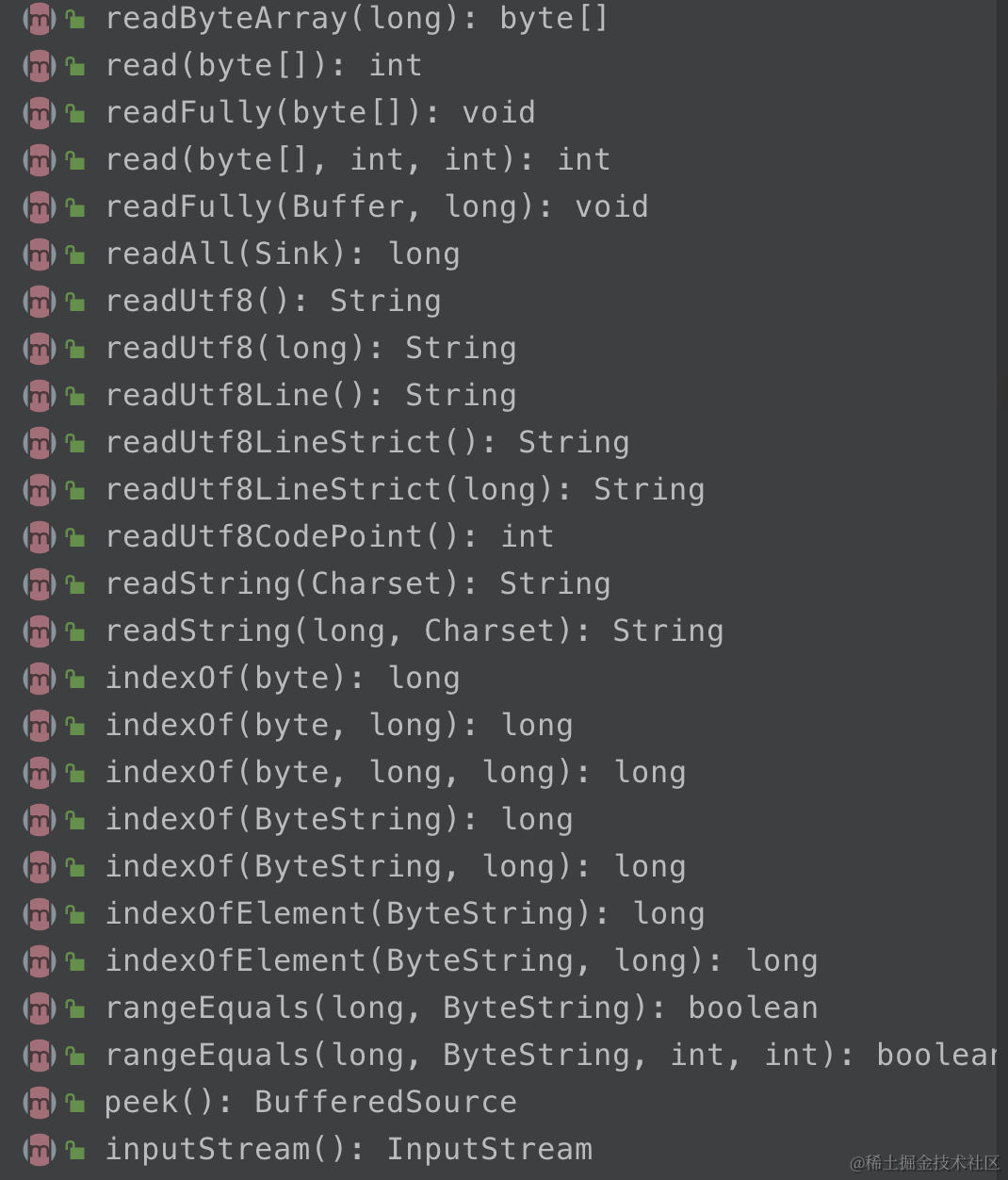 这个示例代码是用来读取文本文件的,Okio 通过 Okio.source(File) 的方式来读取文件流,它返回的是一个 Source 对象,但是 Source 对象的方法是比较少的(只有3个),因此 Okio 提供了一个装饰者对象接口 BufferedSource,通过 Okio.buffer(fileSource) 来生成,这个方法内部实际会生成一个 RealBufferedSource 类对象,RealBufferedSource 内部持有Buffer缓冲对象可使 IO 速度更快,该类实现了BufferedSource接口,而 BufferedSource 接口提供了大量丰富的接口方法: