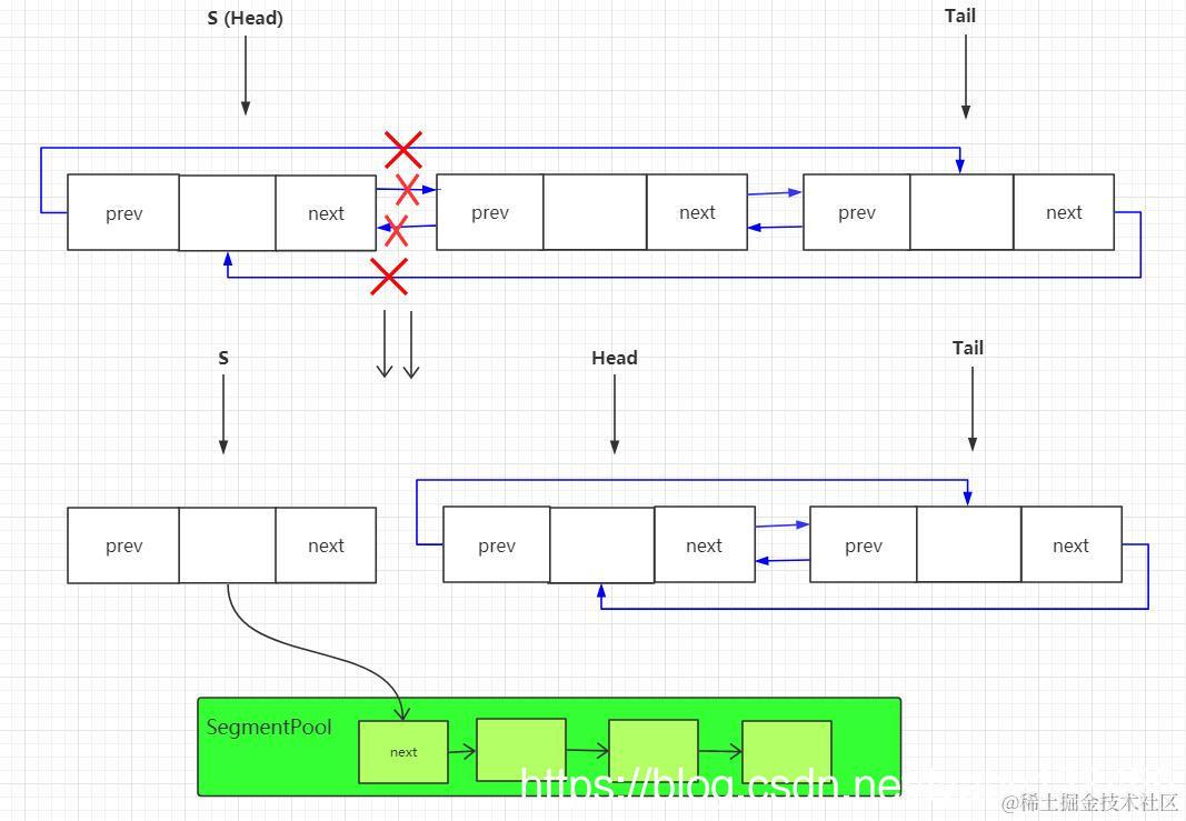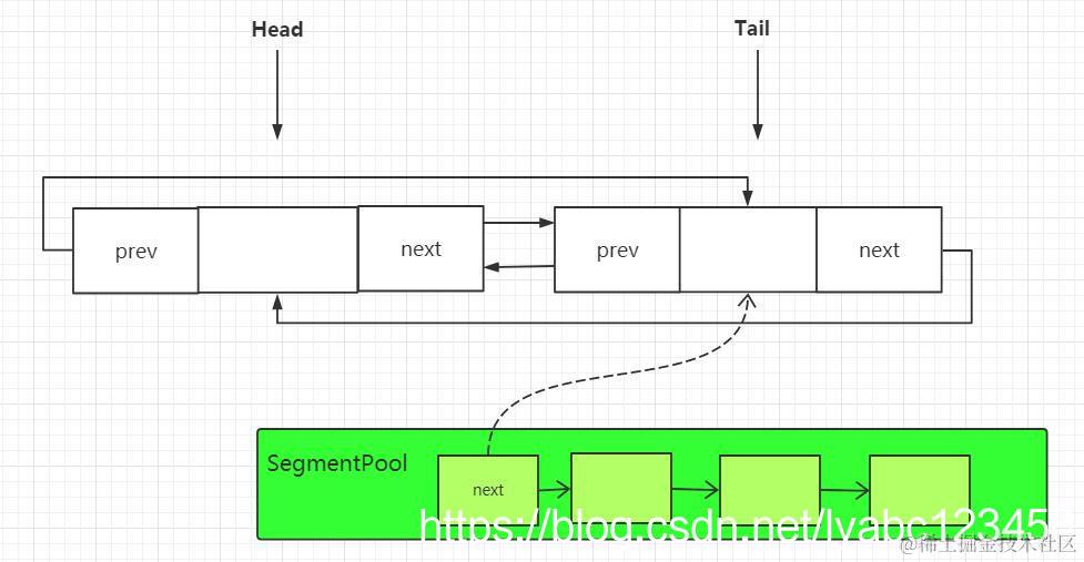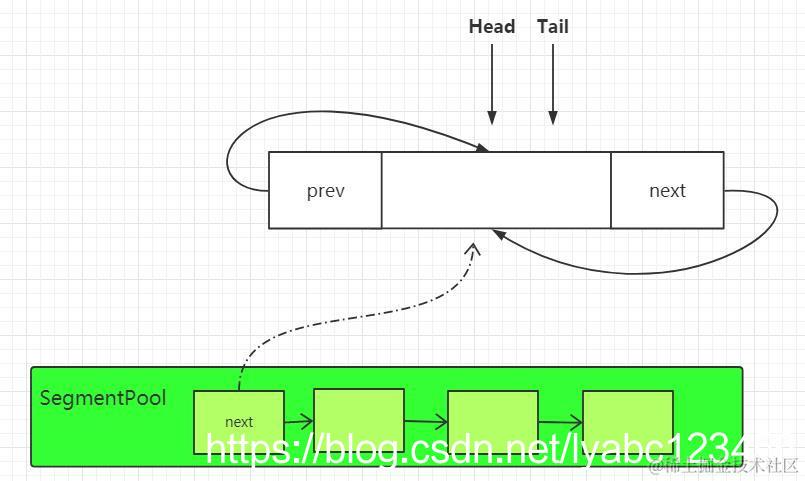 Segment在 Okio 中作为数据缓冲的载体,一个 Segment 的数据缓冲大小为 8192,即 8k。每一个 Segment 都有前驱和后继结点,也就是说 Sement 是一个双向链表链表,准确的来说是一个双向循环链表。读取数据从 Segment 头结点读取,写数据从 Segment 尾结点写。