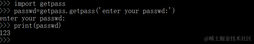 input 在接收输入的时候,是可以看到你输入的值的,如果是输入密码这样的呢,不想让别人看到你的密码,怎么办呢,就需要用到一个标准库,getpass,什么是标准库呢,就是不需要你再去安装,装完 python 就有的库,就是标准库,getpass 就是一个标准库,导入进来之后,直接使用 getpass.getpass 方法就可以在输入的时候,不会显示了: