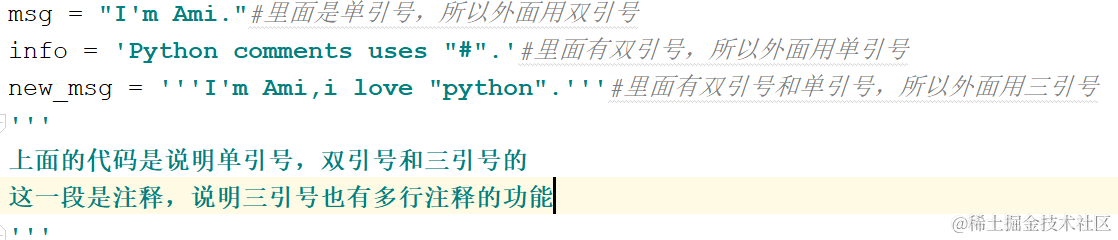 python 中定义变量的时候字符串都用引号引起来,此时单引号和双引号没有区别。但是如果字符串中有单引号的话,外面就得用双引号;如果里面有双引号,外面就用单引号;如果既有单引号又有双引号,那么用三引号,三引号也可以多行注释代码,单行注释,使用#。