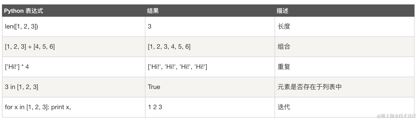 列表对 + 和 * 的操作符与字符串相似。+ 号用于组合列表,* 号用于重复列表。如下所示: