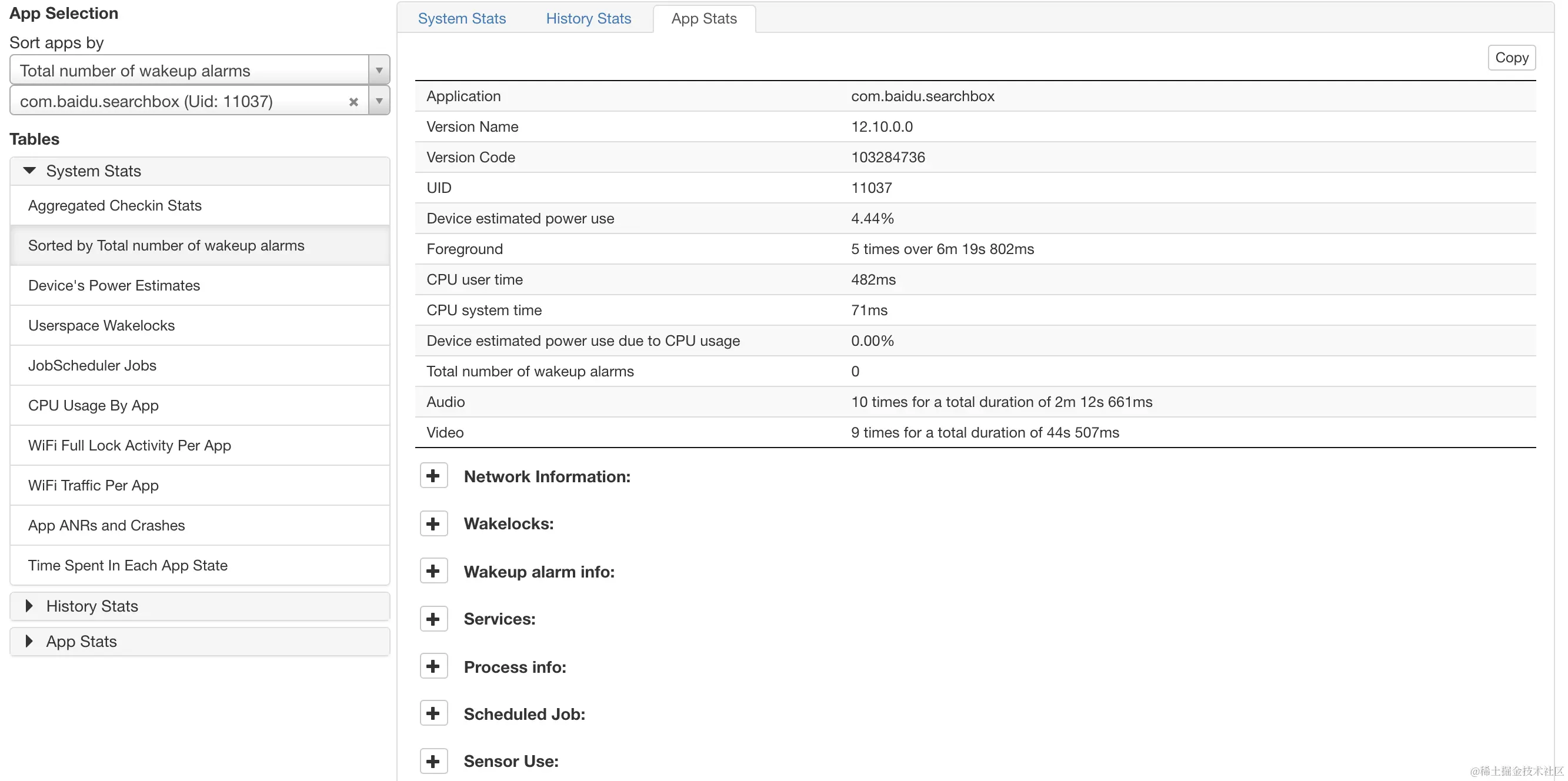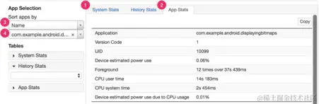 Battery Historian图表下为数据分析,包括三个Tab,如下图所示,可以查看App更多信息:
