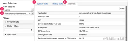 - 标号4:在下拉列表中选择指定的APP后可在App Stats中查看具体信息,App Stats所展示的都是所选定App产生的数据,不会受到外部因素的影响;
