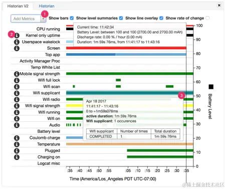 - 标号3:将鼠标悬停在某个条目上可以查看该指标的更多详细信息,以及时间线上特定点的耗电量信息;