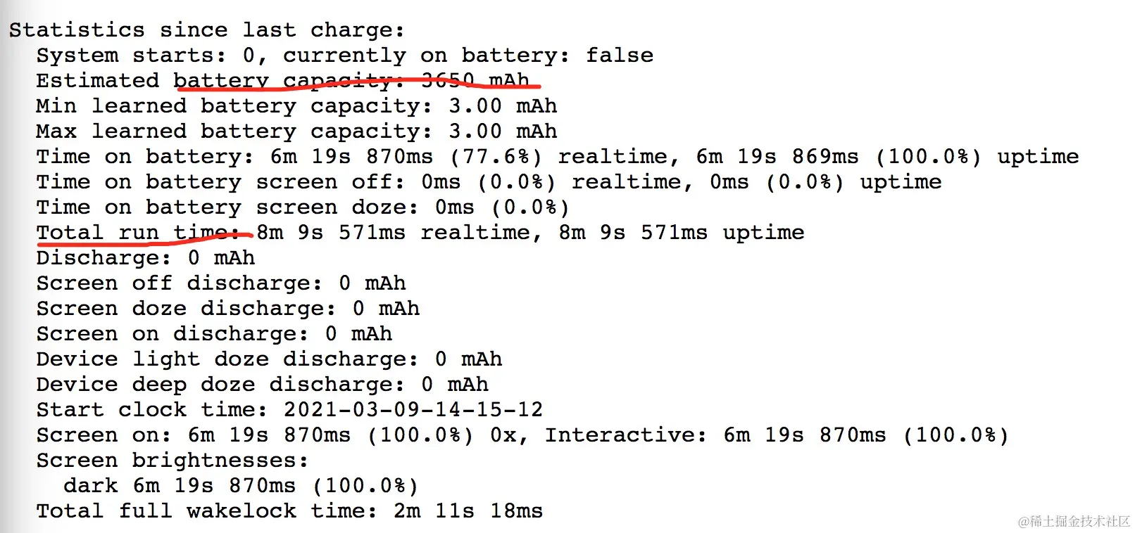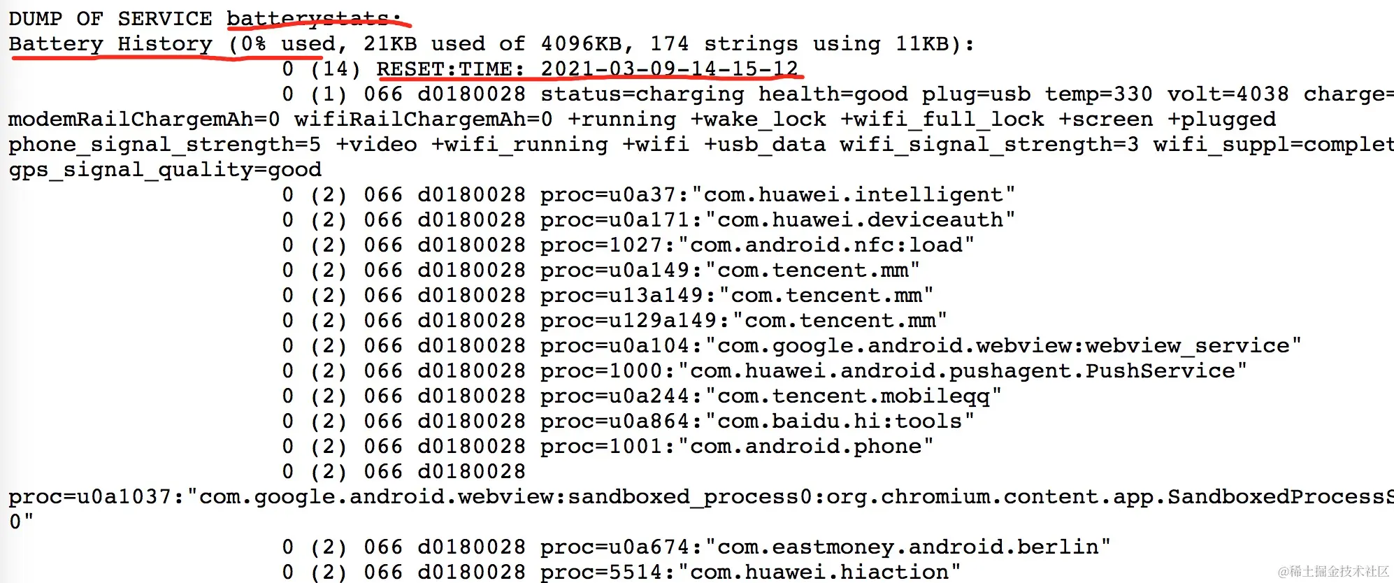- 电量统计信息起始,包含 reset 时间,进程信息等