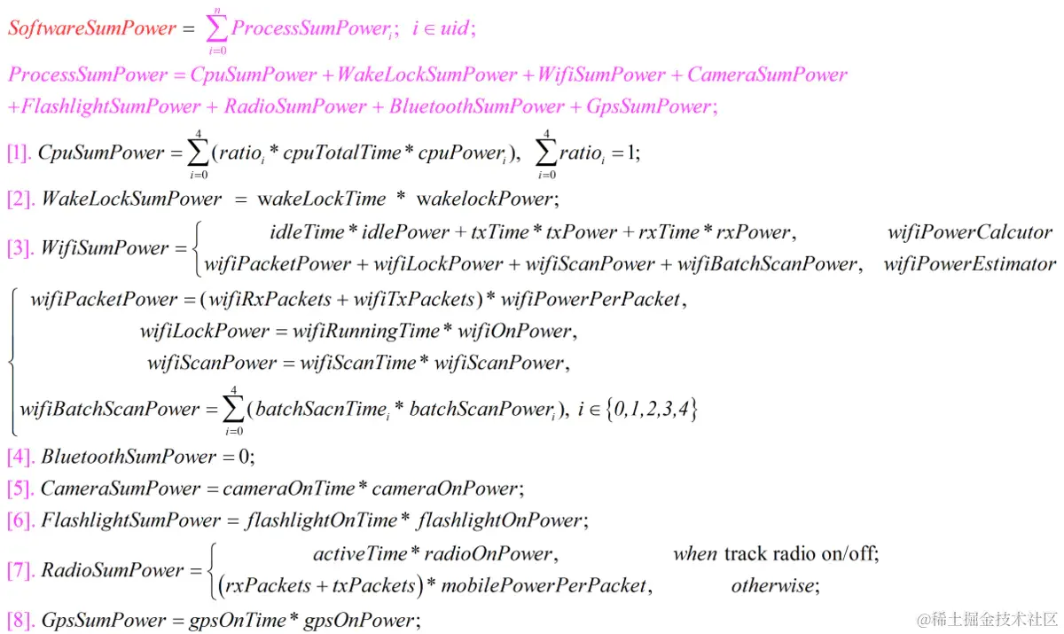 应用总功耗是上述八个统计值的和。这八个统计器同继承自 PowerCalculator.java
