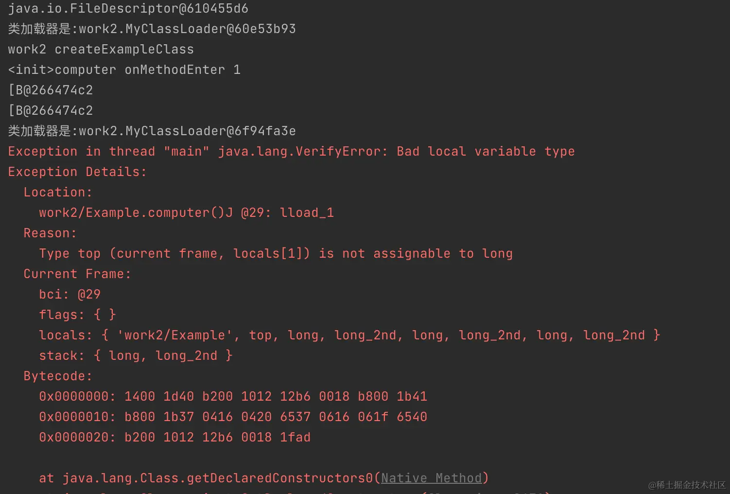 从class 文件来看,生成的 class 文件是没有问题的,结果在反射调用的时候报了异常:
