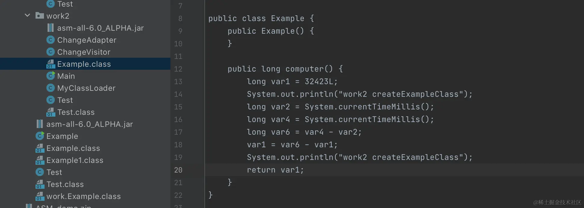 这个 Example 类很简单,只有简单的包名,加上一个静态 main 方法,打印输出 createExampleClass 。
