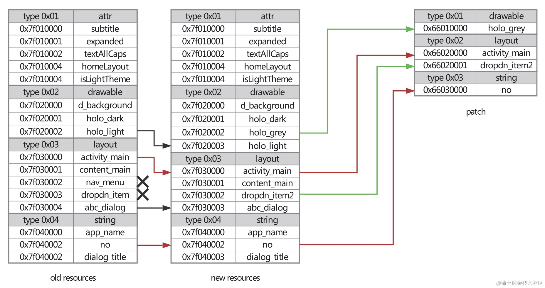 - 对于修改资源,比如替换了一张图片之类的情况。我们把它视为新增资源, 在打入补丁的时候,代码在引用处也会做相应修改,也就是直接把原来使用旧资源 id 的地方变为新 id。
