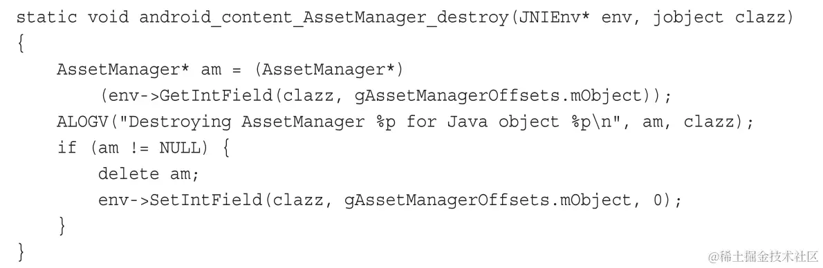 可以看到,首先,它析构了 native 层的 AssetManager,然后把 java 层的 AssetManager 对 native 层的 AssetManager 的引用设为空。
