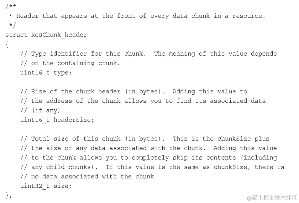 整个 resources.arse 文件,实际上是由一个个 ResChunk (以下简称 chunk) 拼接起来的。从文件头开始,每个 chunk 的头部都是一个 ResChunk_header 结构,它指示了这个 chunk 的大小和数据类型。
