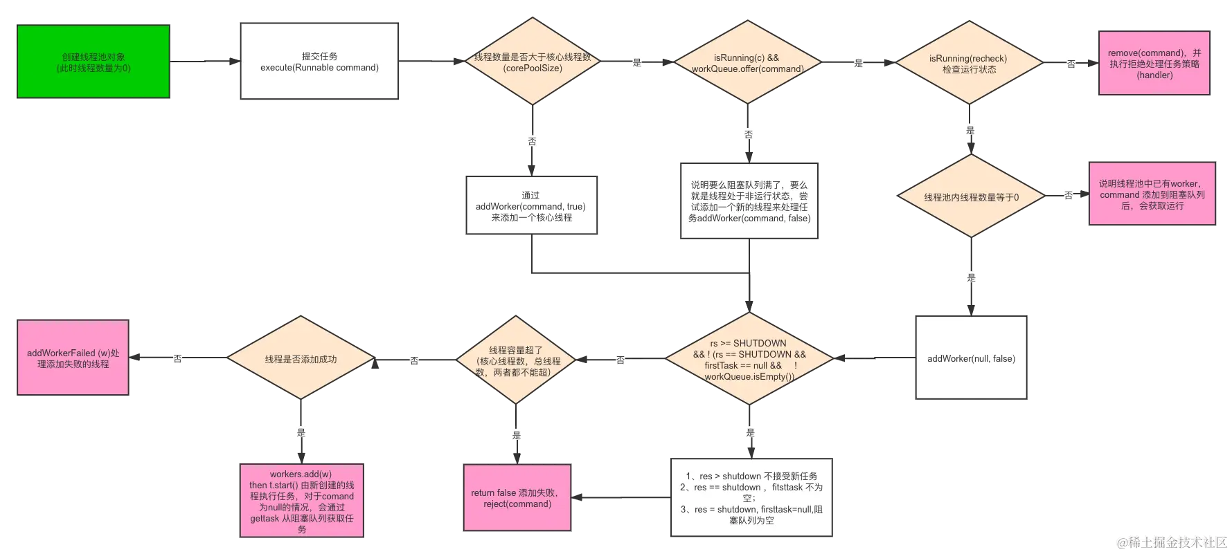 在去具体分析 ThreadPoolExeCutor 运行逻辑前,先看下面的流程图: