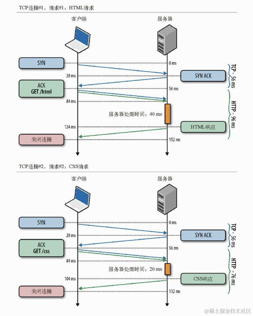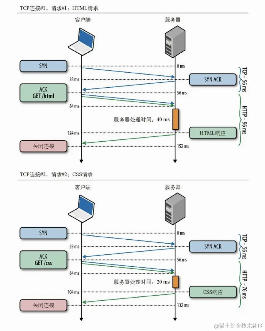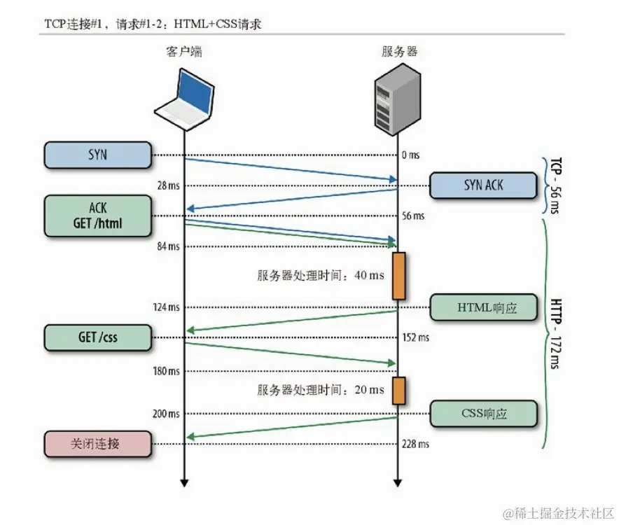 实际上,这时候最简单的优化就是重用底层的连接!添加对HTTP持久连接的支持,就可以避免第二次TCP连接时的三次握手、消除另一次TCP慢启动的往返,节约整整一次网络延迟。