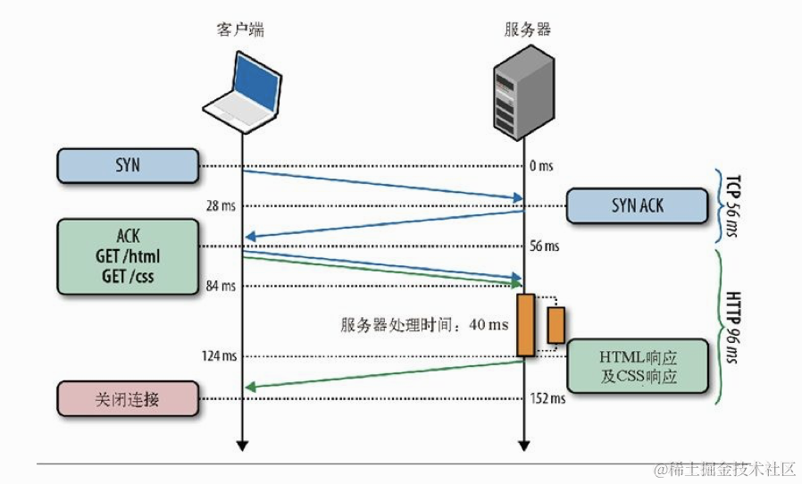 服务器处理时间无法预测,因为这个时间因资源和后端硬件而异。不过,这里的重点其实是由一个新TCP连接发送的HTTP请求所花的总时间,最少等于两次网络往返的时间:一次用于握手,一次用于请求和响应。这是所有非持久HTTP会话都要付出的固定时间成本。