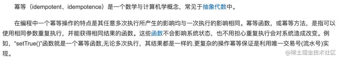 用户注册,用户创建商品等操作,前端都会提交一些数据给后台服务,后台需要根据用户提交的数据在数据库中创建记录。如果用户不小心多点了几次,后端收到了好几次提交,这时就会在数据库中重复创建了多条记录。这就是接口没有幂等性带来的 bug。