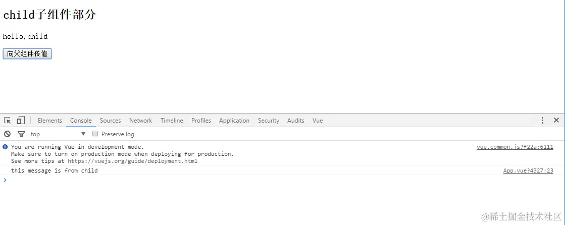 this.$emit方法,第一个参数为父组件定义的方法名称event,第二个参数为传递的值- 在父组件中注册子组件并在子组件标签上绑定对自定义事件的监听(