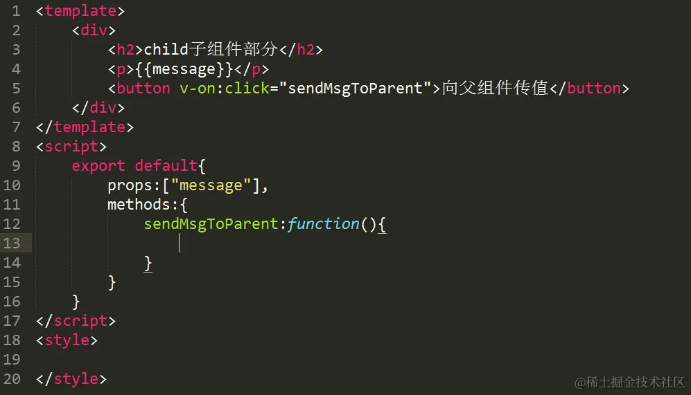 - 子组件中需要以某种方式的方法来触发一个自定义事件(例如点击事件)