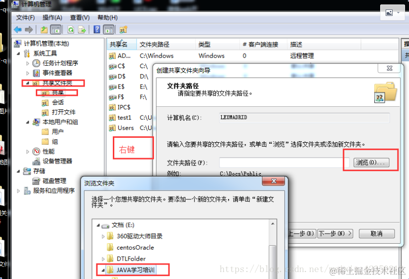 如何在局域网中的实现文件共享 分配权限给指定用户 LexSaints 2021-05-22 651 阅读1分钟 首先明确 共享的机器(服务器) 访问共享的机器(客户机): 要在服务器端,创建相关的用户:例如服务器端IP地址:192.168.1.111 服务器端:计算机 右键--管理 右键 用户--新用户--输入用户名和密码() 服务器端,添加我们需要共享的文件