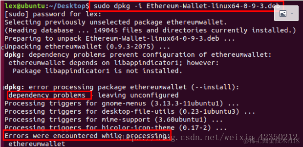 Ubuntu如何安装deb包 使用 dpkg解决依赖性问题 LexSaints 2021-05-22 16,262 阅读1分钟 Ubuntu安装以太坊wallet时,出现依赖问题 sudo dpkg -i xxx.deb 解决方法: 在使用 dpkg -i 安装deb包后,会出现依赖关系而不能正常安装软件,这个时候先更新下源然后解决依赖关系后重装即可。 sudo apt-get update # 更新 sudo apt-get -f install # 解决依赖关系 sudo dpkg -i xxx.deb # 重新安装