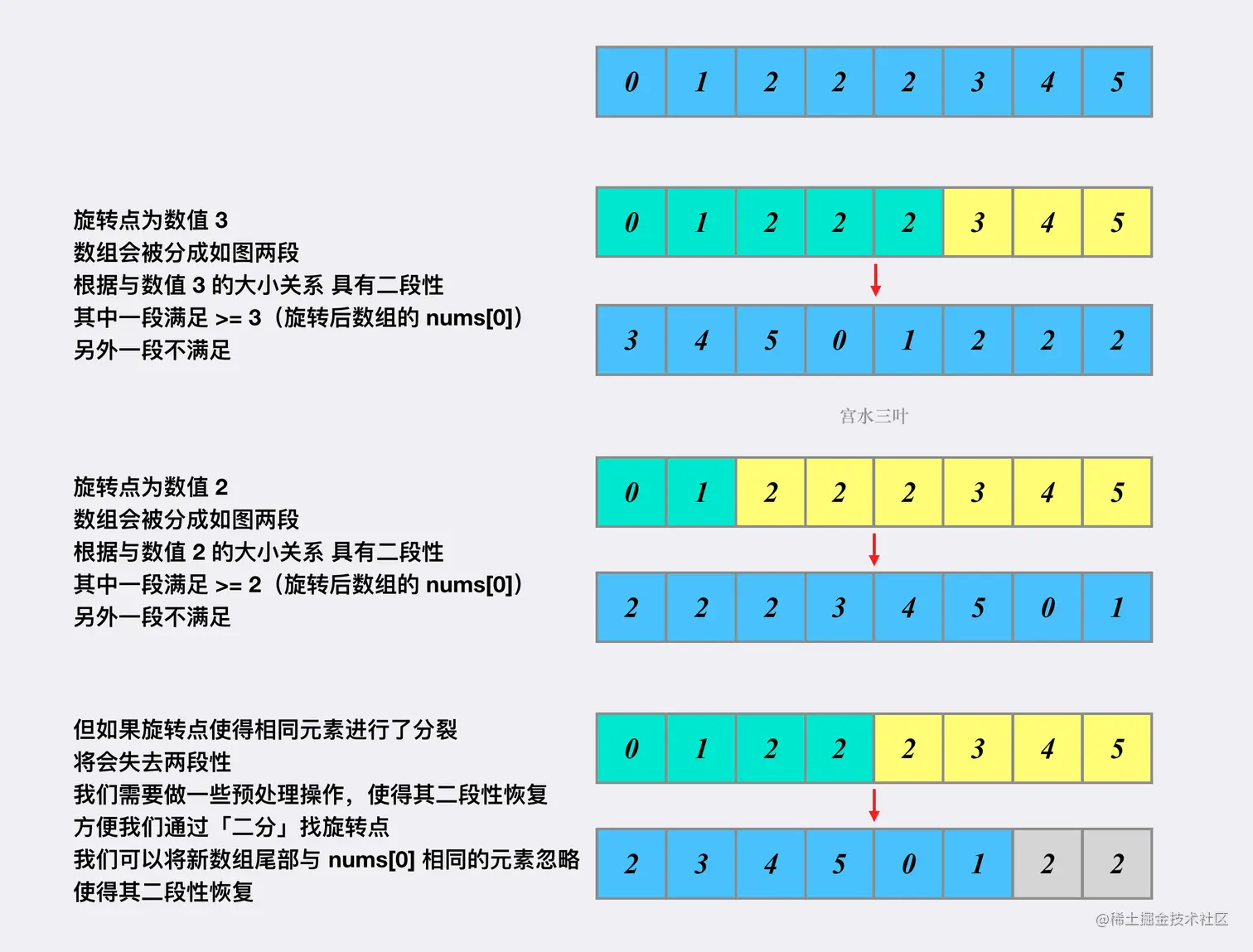举个🌰,我们使用数据 [0,1,2,2,2,3,4,5] 来理解为什么不同的旋转点会导致「二段性丢失」: