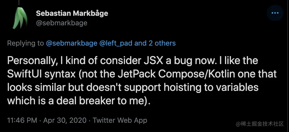他更推崇SwiftUI语法,并认为JSX就是个错误。