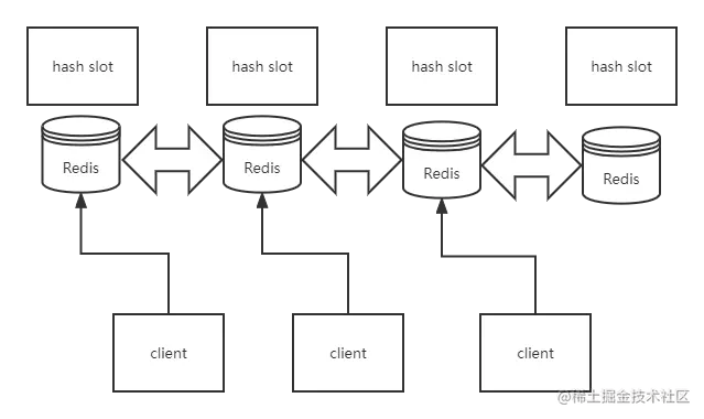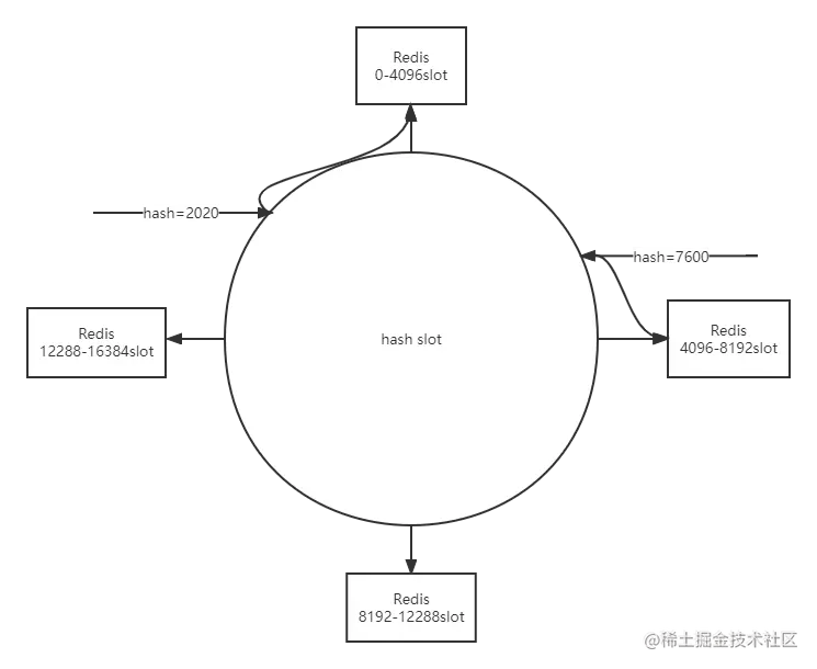 分布式储存方式:使用哈希槽的模式,cluster集群有16384个哈希槽(hash slot)可以分配指定个数的槽给指定的节点,每个Key通过CRC16校验后对16384取模来决定放置哪一个槽。当存取redis key时候,redis会根据CRC16算法得到一个结果,然后把结果和16384求余,通过这个值去对应得节点获取数据。这个时候,应用客户端实际上只需要连接其中任意一个节点即可,然后Redis Cluster 中每个节点都保存了其他节点得槽信息。这样当存取key计算完槽之后,通过保存槽信息从配置中获取节点信息,然后再去对应得节点获取数据。