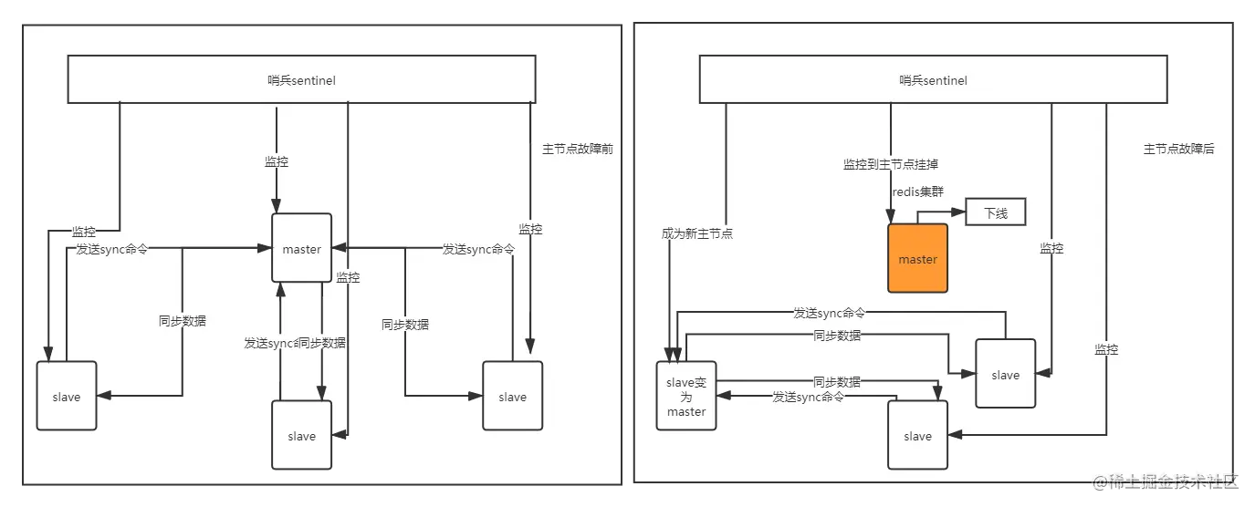 哨兵模式用来监控和调整redis集群,主要功能就是当主节点master挂掉后,不至于让整个集群挂掉,而是从跟节点中选举出新的master