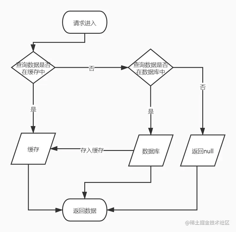 在理解这三个问题之前,先要了解redis的缓存处理机制,在收到用户的请求后,判断缓存中是否有数据,有就返回数据,没有就去查询数据库,如果数据库有数据,就返回数据,并且将该数据存入缓存中。