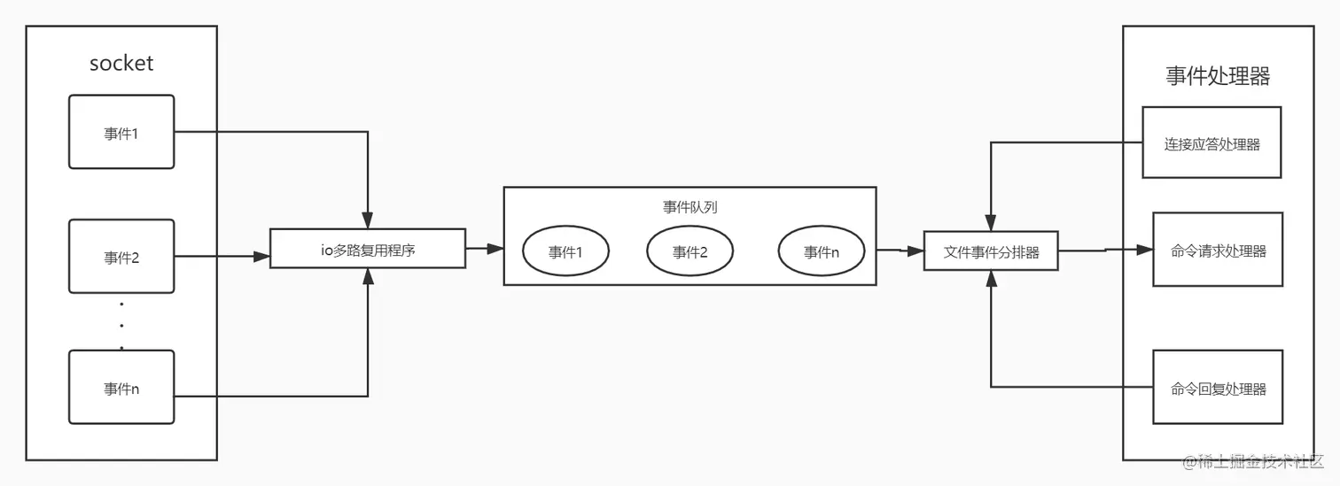 可以看出来,redis是单线程的,socket事件进来后,redis用了一个io多路复用程序接受,这个程序将多个事件压到事件队列中,有序的交给文件事件分派器处理,然后分派器感觉事件的类型调用相应的处理器去处理。