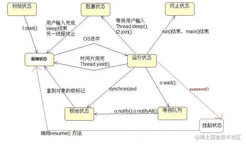 - 结束(Terminated):线程执行完了或者因异常退出了run()方法,该线程结束生命周期。