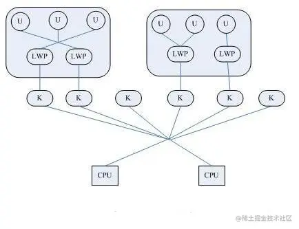 本质是内核线程与用户线程混合使用,可以使用内核提供的线程调度功能及处理器映射,并且用户线程的系统调用要通过轻量级进程来完成,大大降低整个进程被完全阻塞的风险。